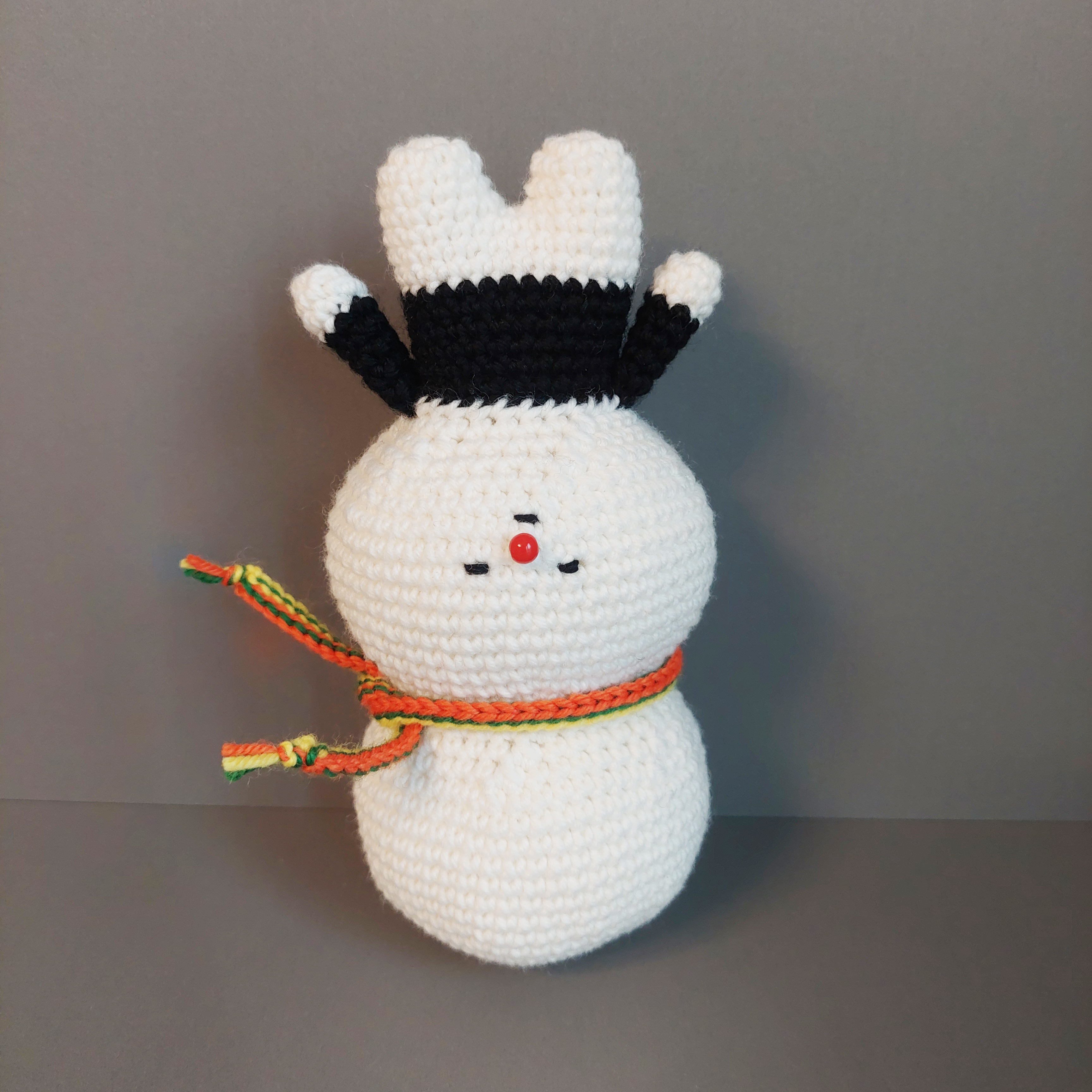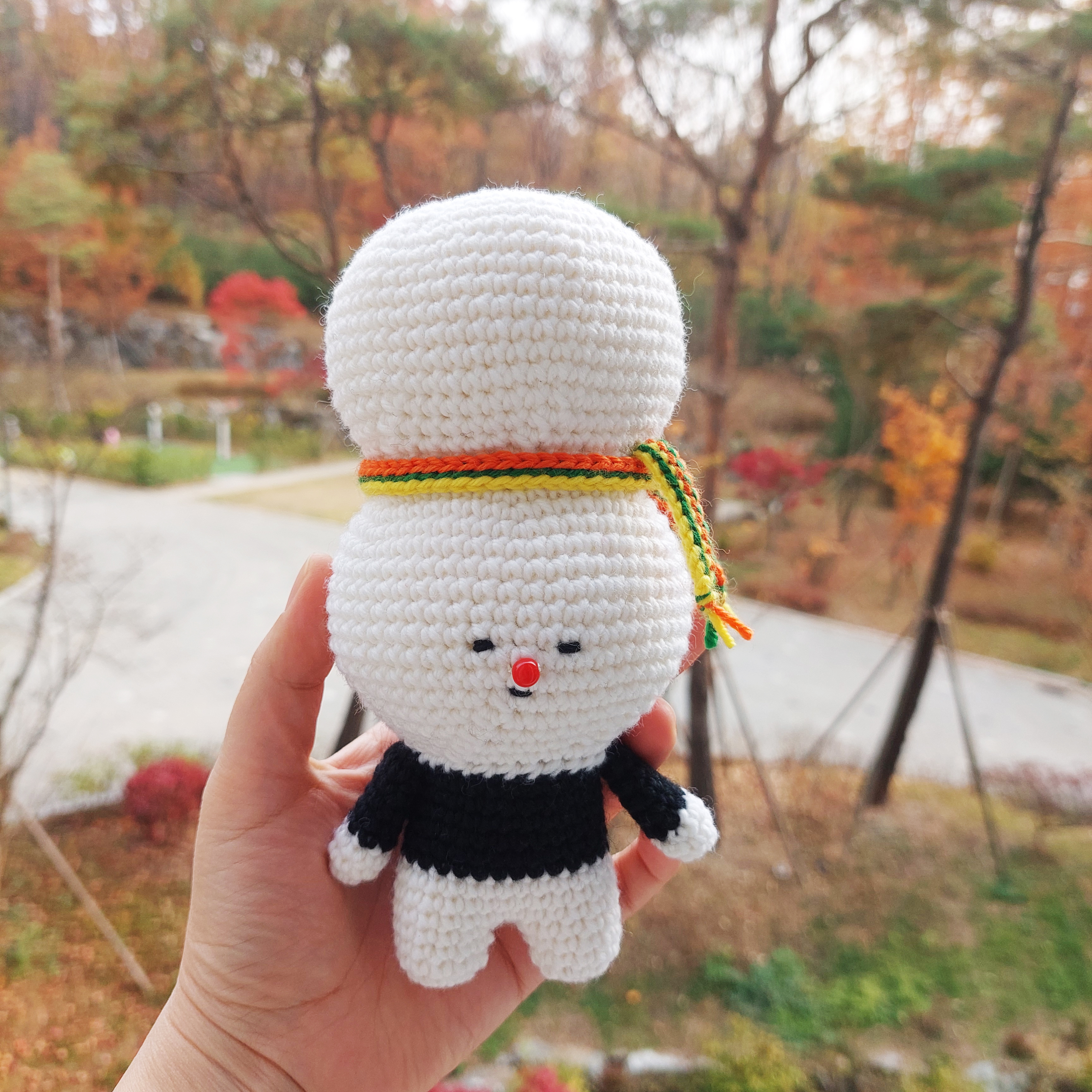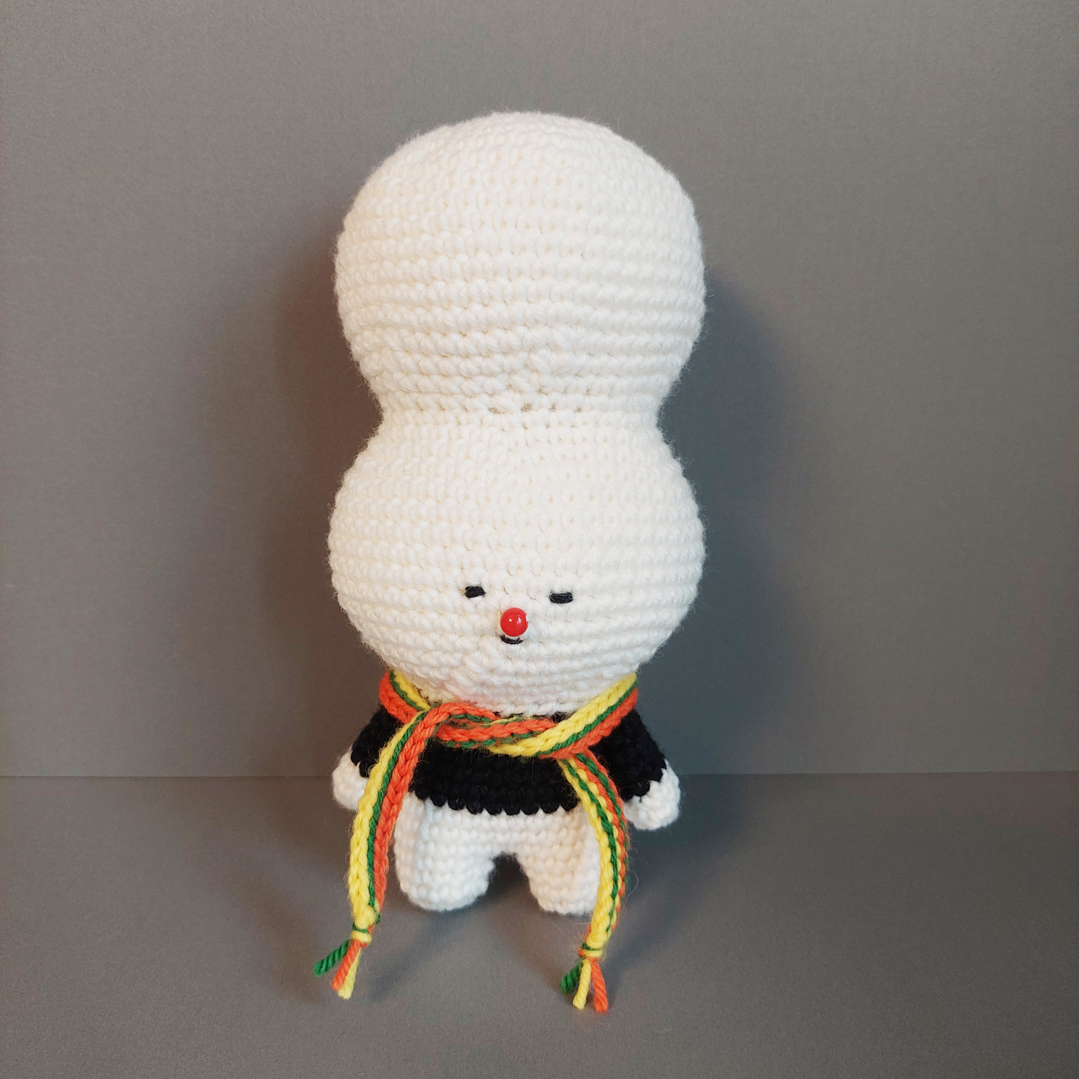 귀여운 조랭이 떡 얼굴을 하고 있는 코바늘 인형입니다.