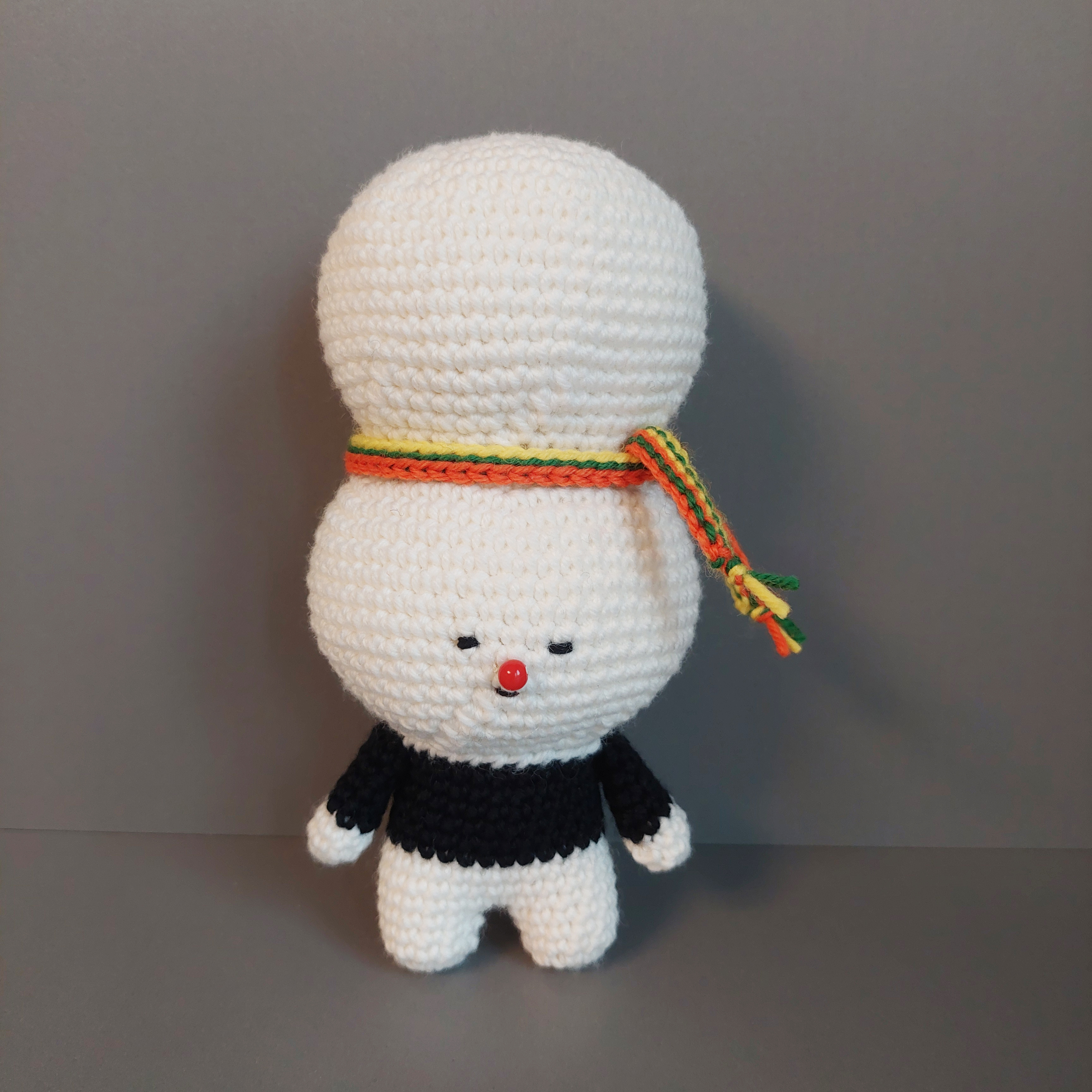귀여운 조랭이 떡 얼굴을 하고 있는 코바늘 인형입니다.