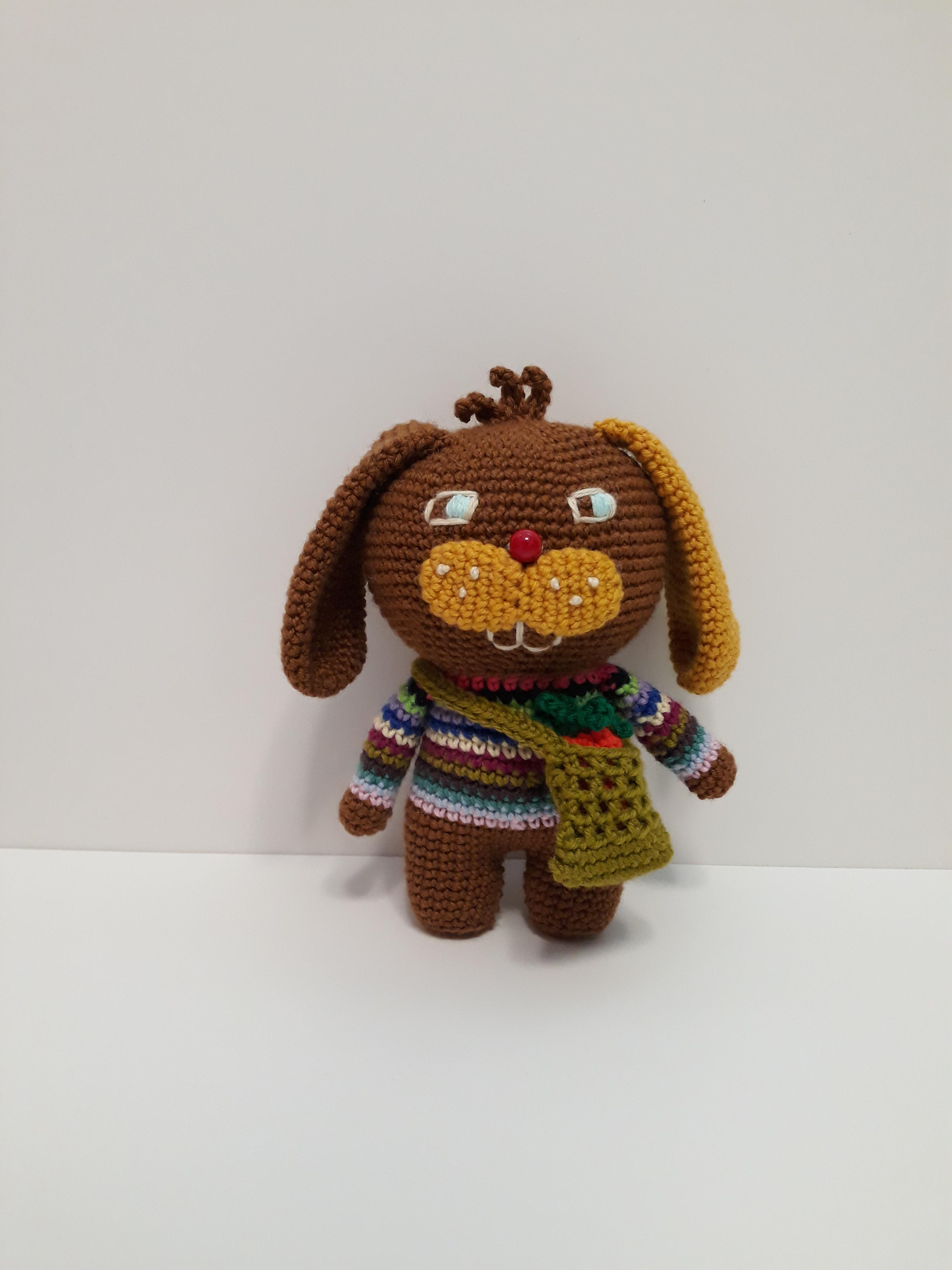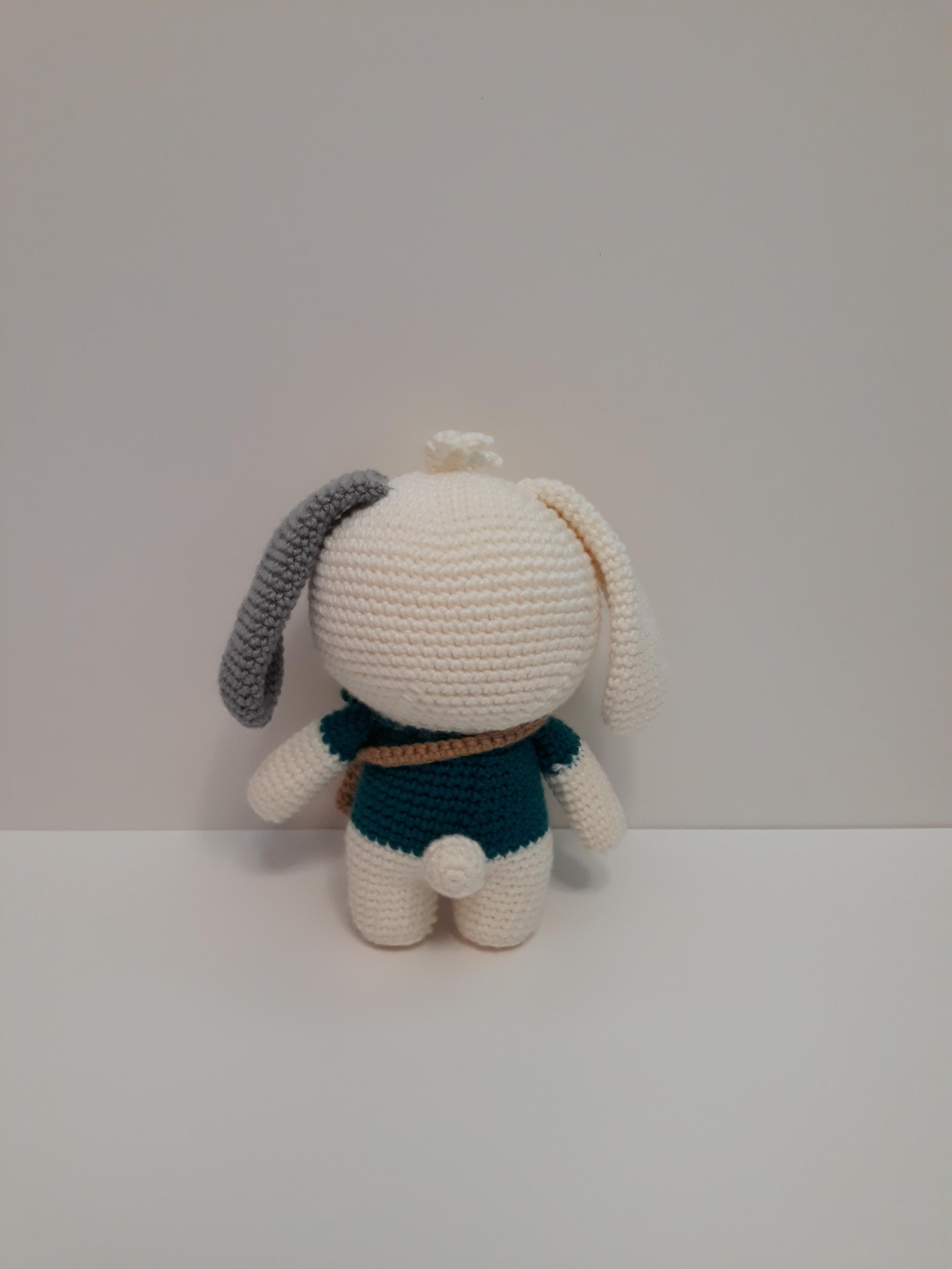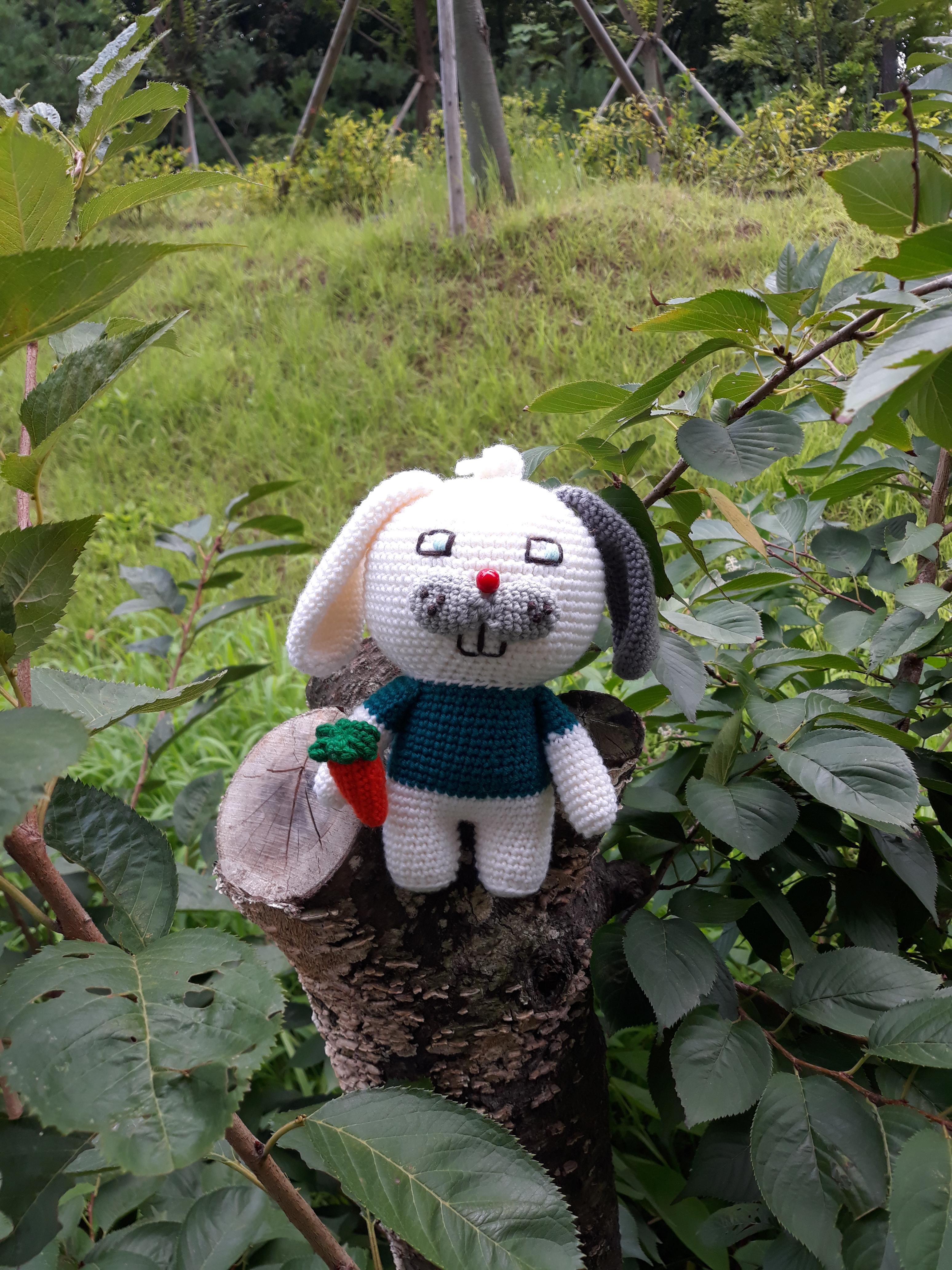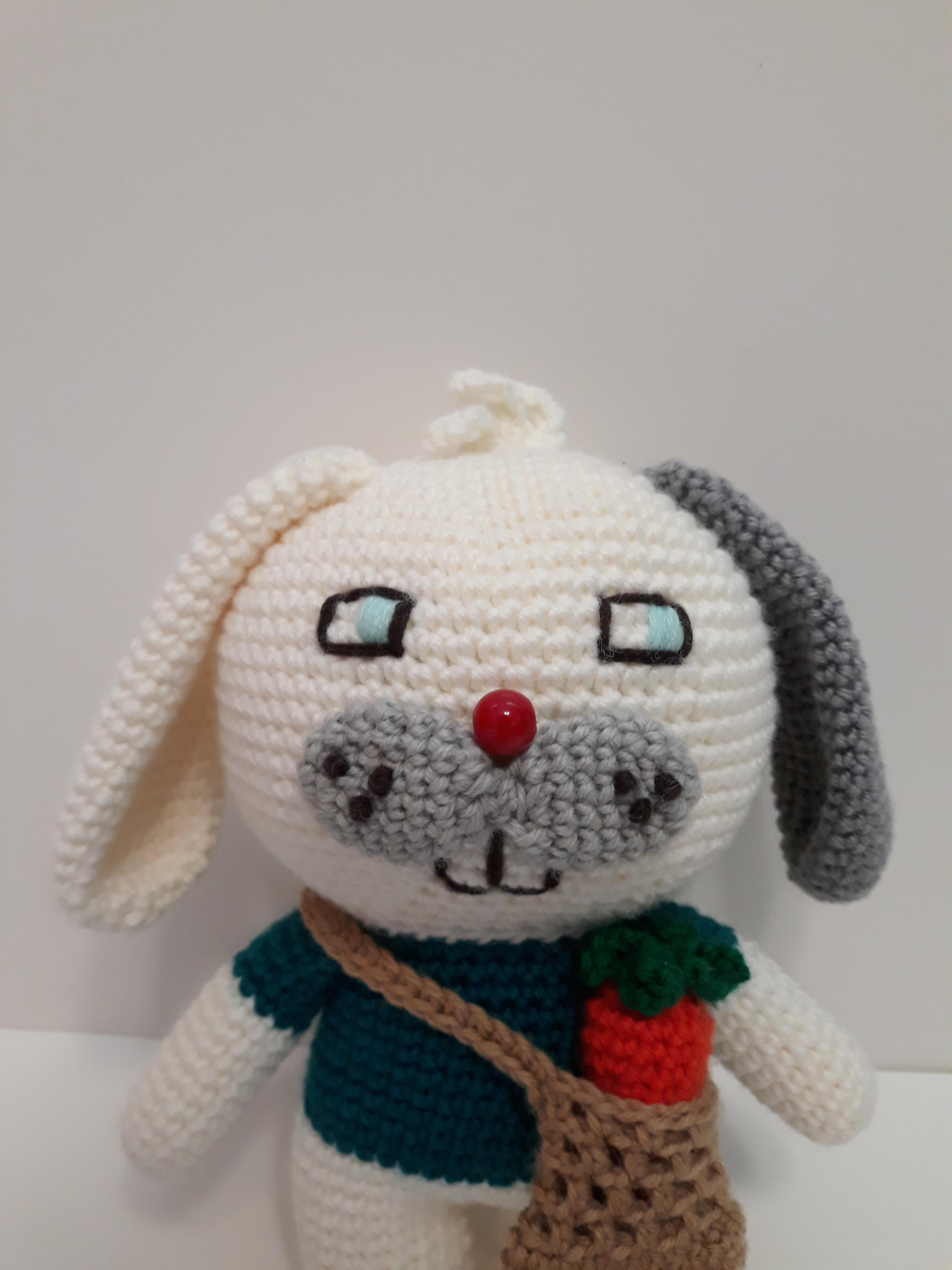 큰귀와 커다란 앞니가 매력적인 토끼 코바늘 인형이예요.