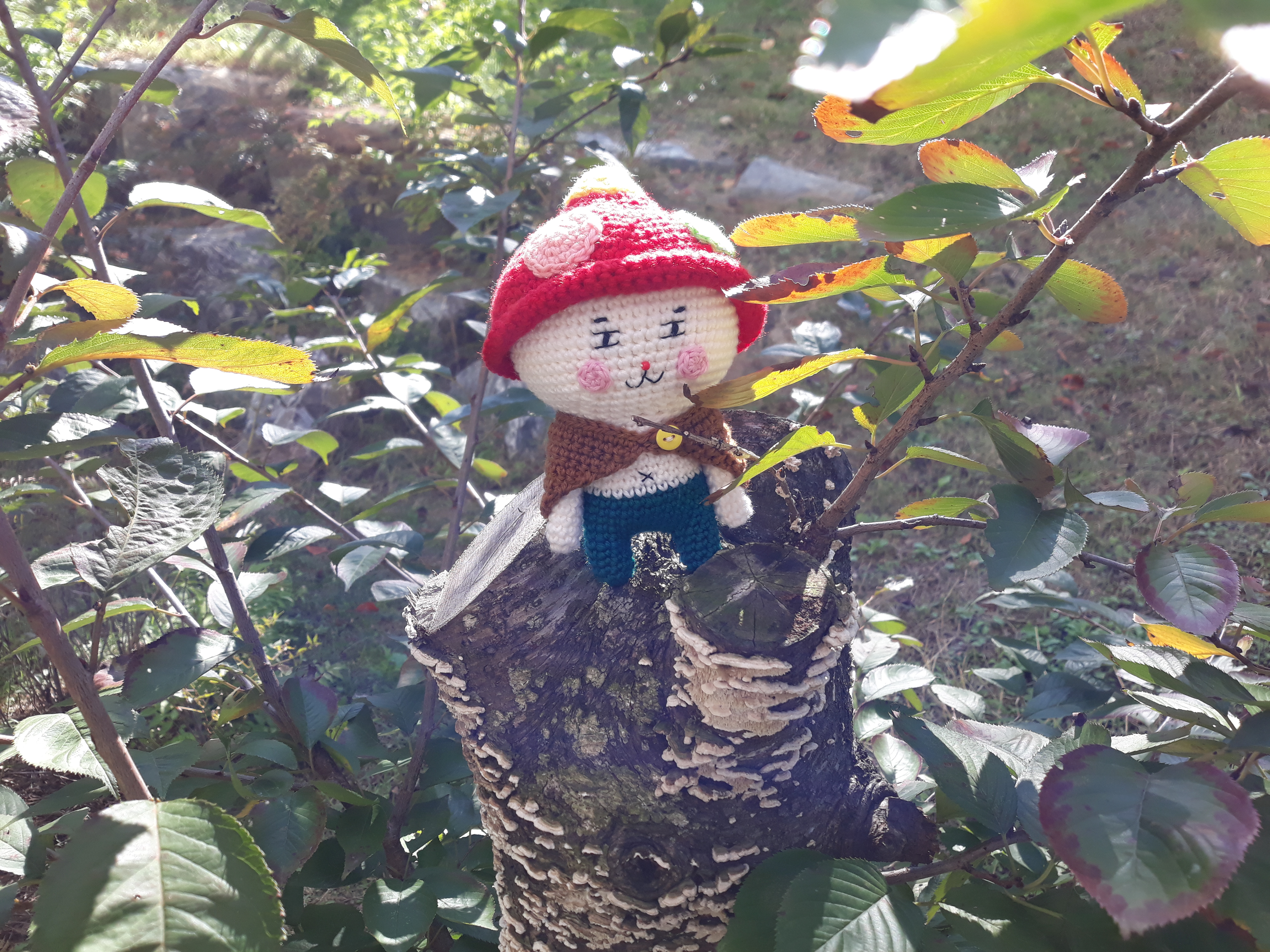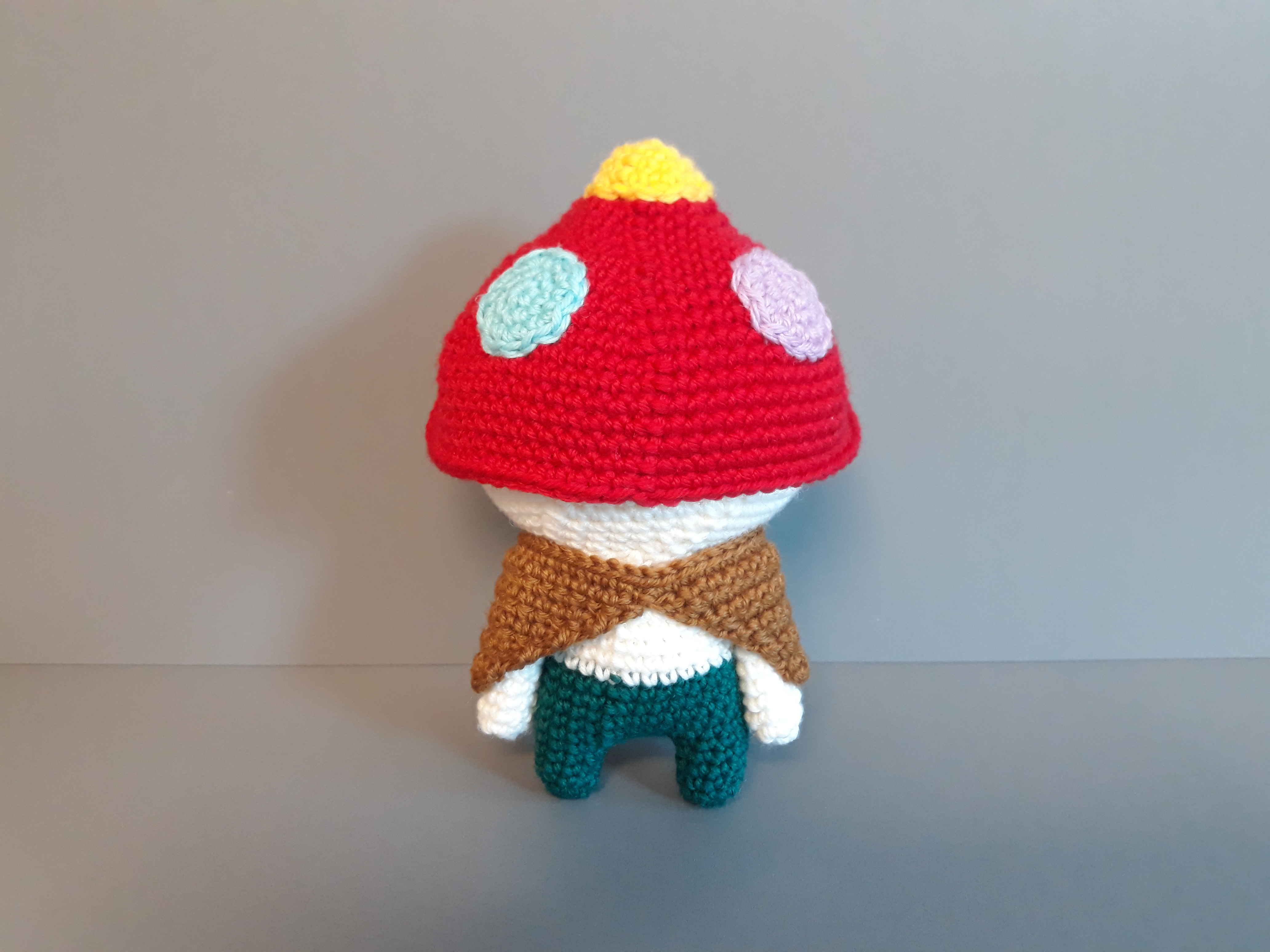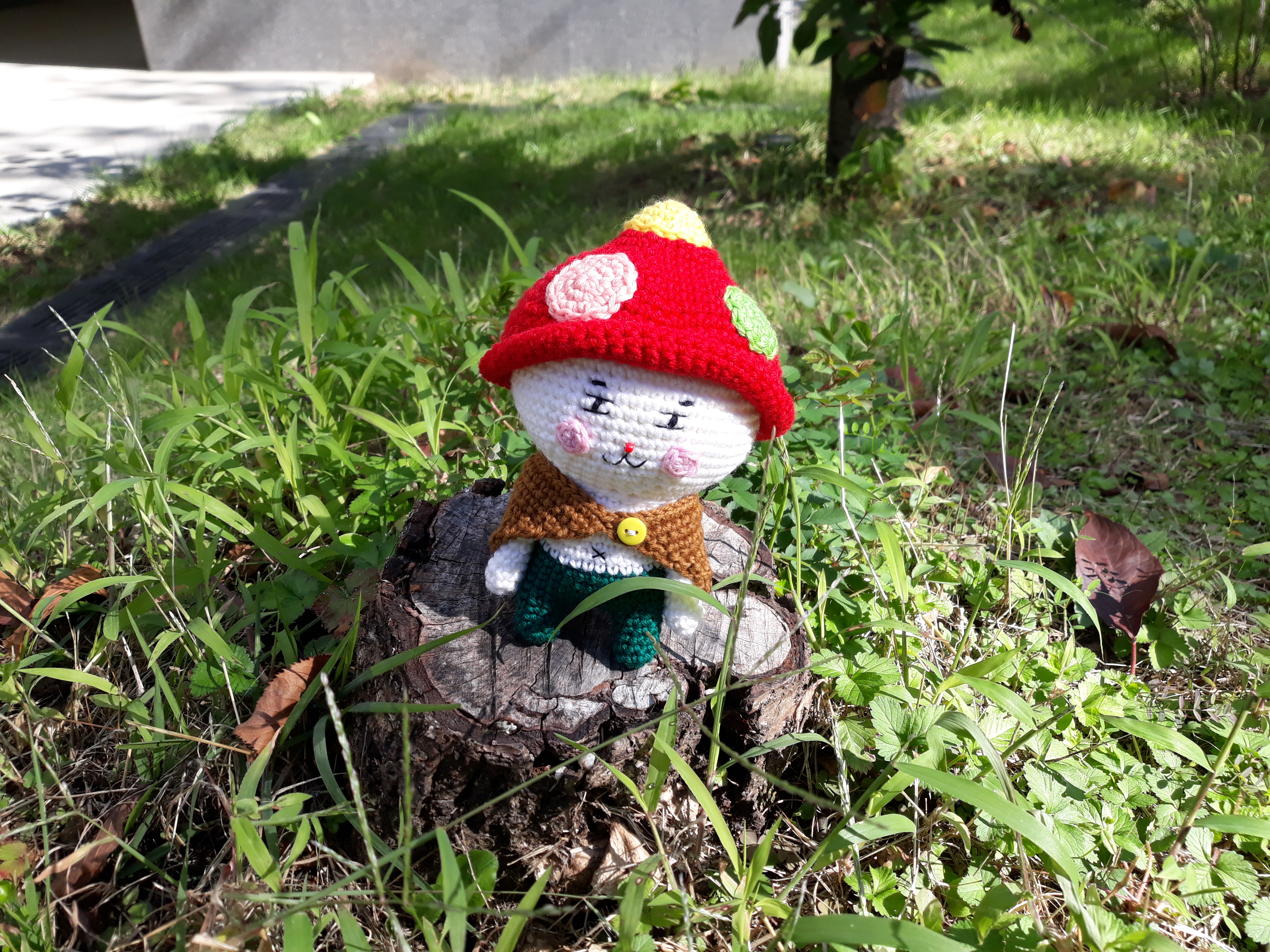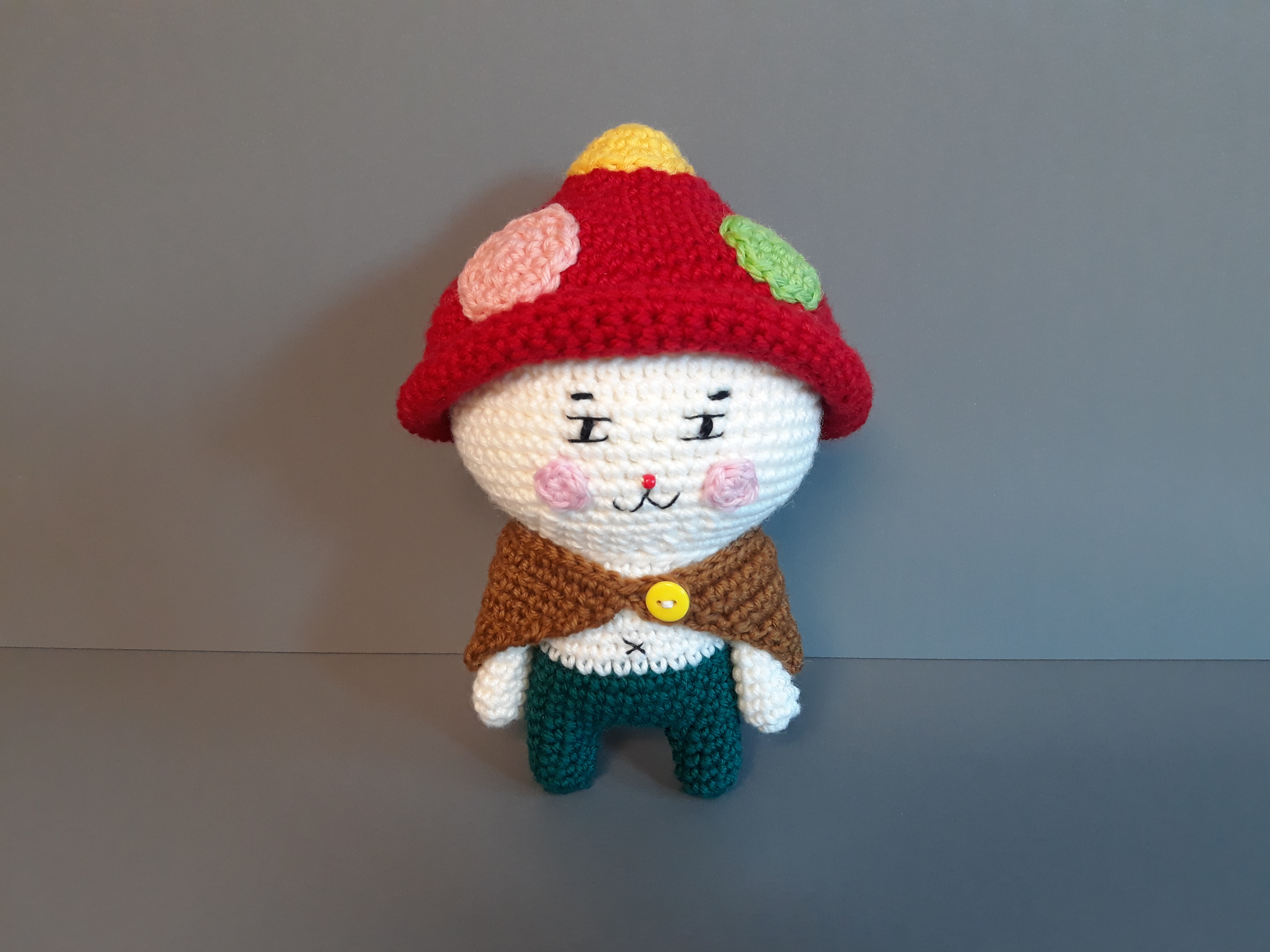 빨간색 버섯모자와 갈색 망토를 걸치고 있는 인형이에요.