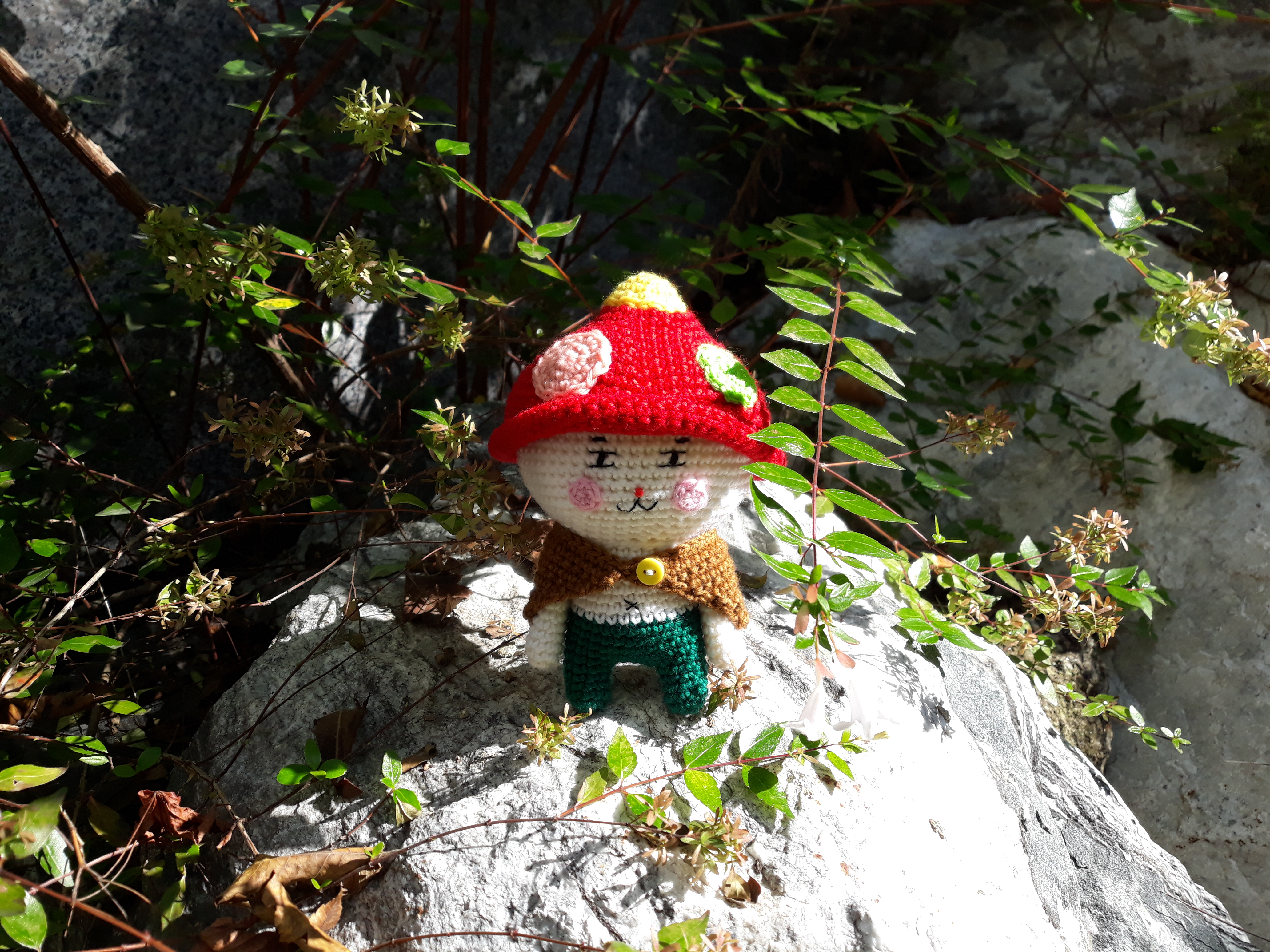 빨간색 버섯모자와 갈색 망토를 걸치고 있는 인형이에요.